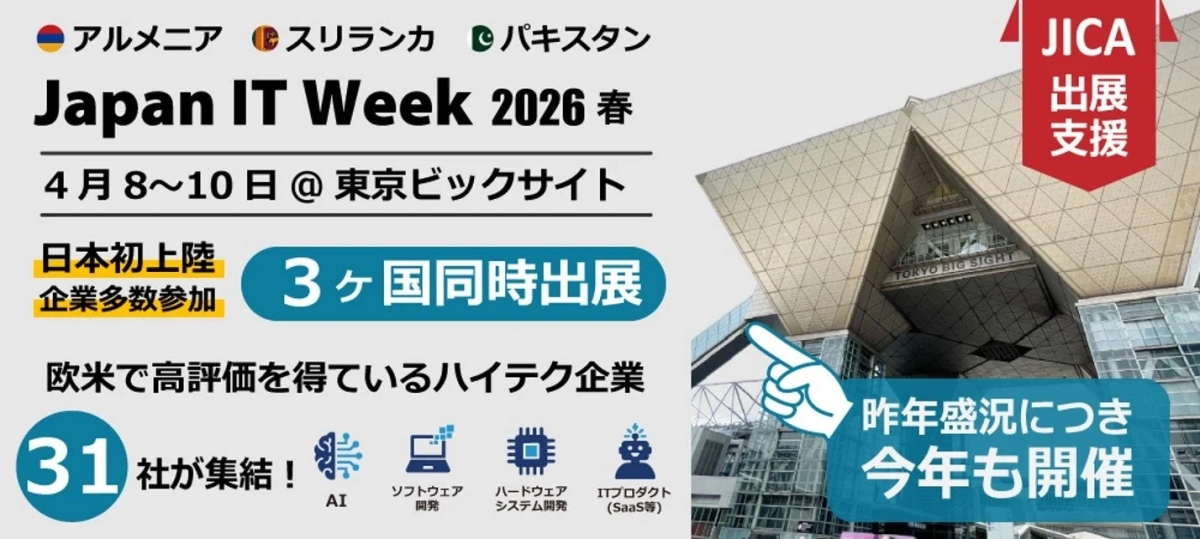 「Japan IT Week 2026 春」に、アルメニア、スリランカ、パキスタンから選ばれた31社のハイテク企業が出展します。これらの企業は欧米で高い評価を受けており、独立行政法人国際協力機構(JICA)が日本企業との協業を支援します。