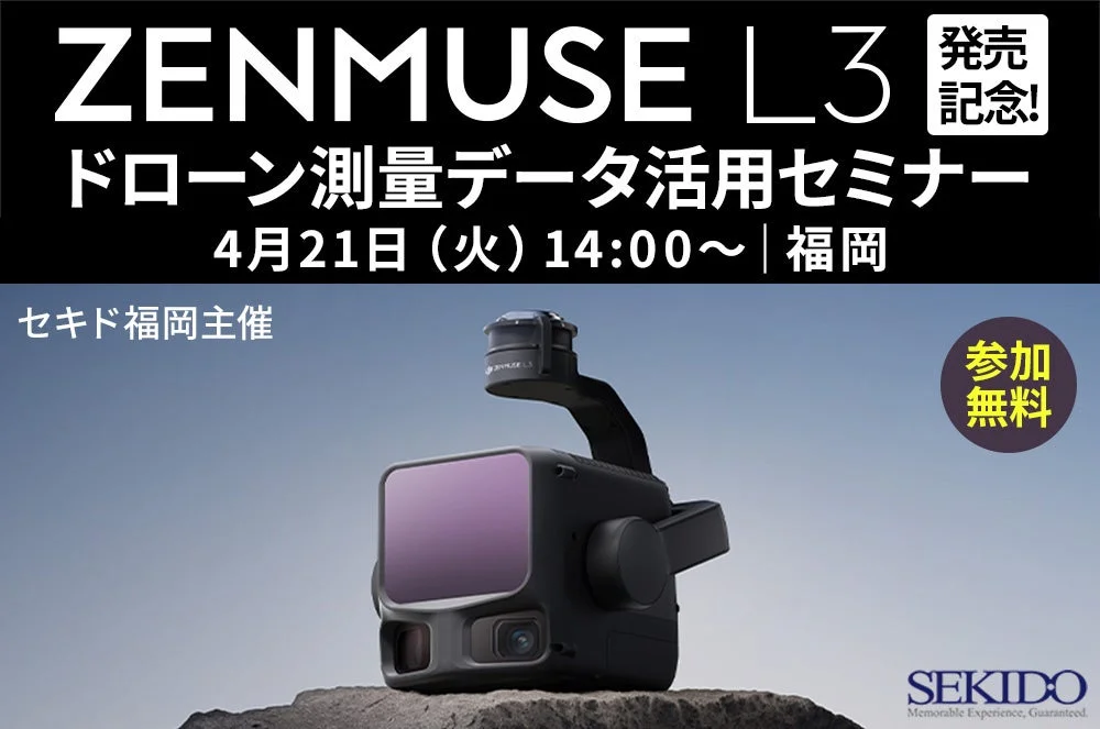 株式会社セキドは、2026年4月21日(火)に福岡県福岡市で無料セミナー「『DJI ZENMUSE L3』発売記念!ドローン測量データ活用セミナー in 福岡」を開催します。このセミナーは、DJI正規販売代理店であるセキド福岡が主催し、ドローン測量データの取得から活用までの流れを短時間で理解できる内容です。