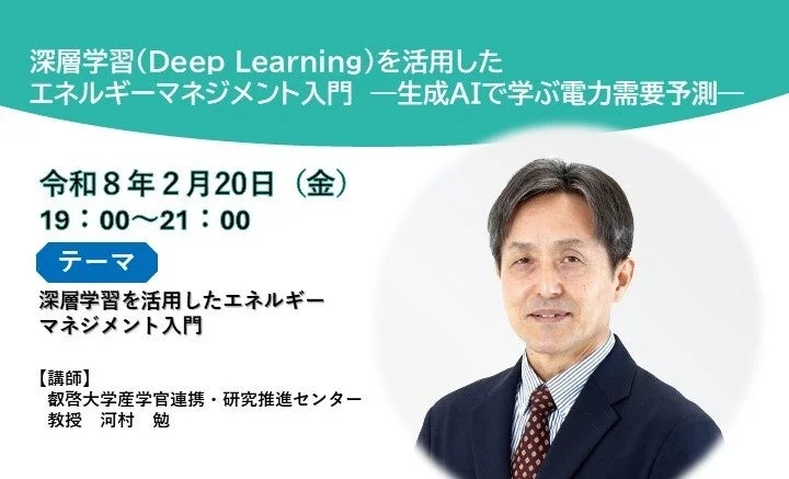 叡啓大学は、2026年2月20日に公開講座「深層学習(Deep Learning)を活用したエネルギーマネジメント入門―生成AIで学ぶ電力需要予測―」を開催します。この講座は、エネルギー管理に携わる方だけでなく、AI技術に関心を持つ社会人の方々を対象に、生成AIを使って電力の消費量を予測する仕組みを分かりやすく解説します。