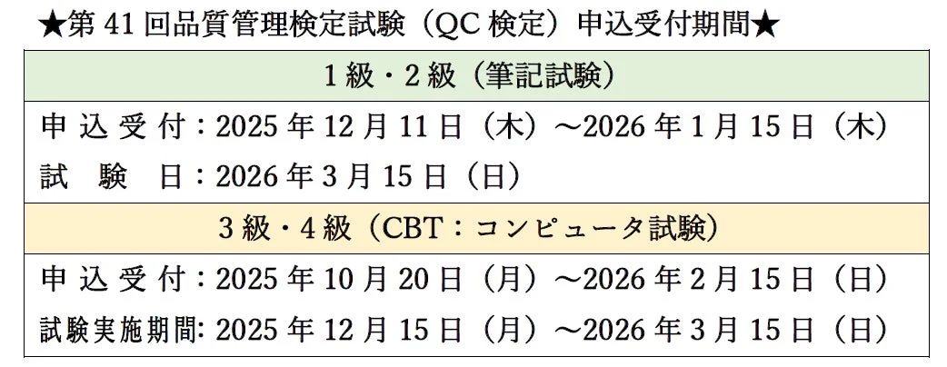 一般財団法人日本規格協会は、第41回品質管理検定(QC検定)の3級と4級の申込受付を開始しました。1級と2級の受付は2025年12月11日から始まる予定です。この検定の累計申込者は175万人を超えており、多くの企業や学生が品質管理の知識を学ぶために活用しています。