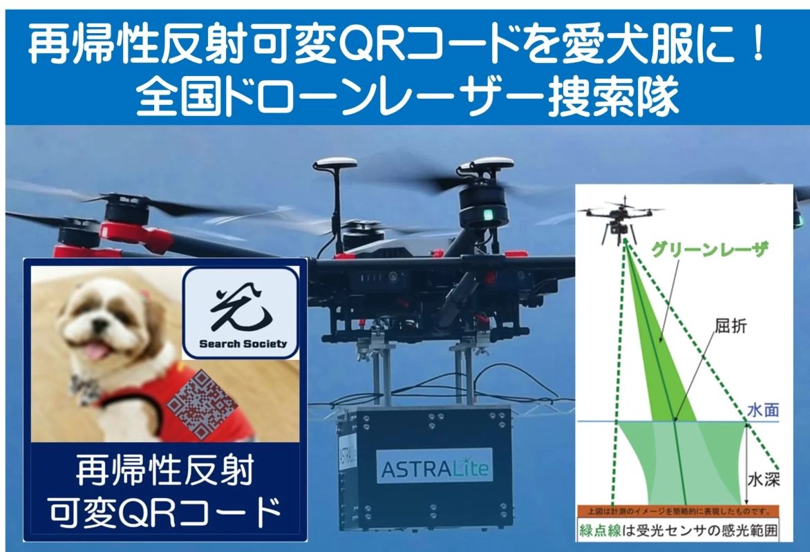 NPO法人光探索協会は、東日本幹事企業のAPEX株式会社、西日本幹事企業のSMGコンサルタント株式会社と協力し、「全国ドローンレーザー捜索隊」を結成しました。この取り組みは、大地震による津波災害時、特に夜間でも家族同然の愛犬を捜せるように、無人ドローンレーザー捜索システムと「再帰性反射可変QRコード」の普及を目指すものです。