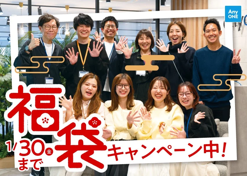 オフィスで笑顔の男女9人が、手を振ったりピースサインをしたりしてポーズを取っている集合写真です。1月30日までの福袋キャンペーンを告知しています。