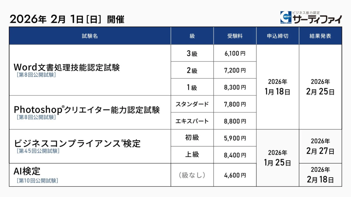 サーティファイ、Word、Photoshop、ビジネスコンプライアンス、AIの認定試験申込受付を開始