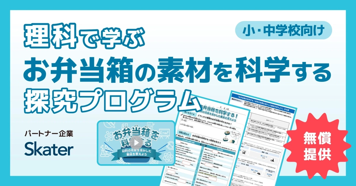今回は、お弁当箱をはじめとした日用品の企画・製造・販売を手がけるスケーター株式会社と連携し、「理科で学ぶお弁当箱の素材を科学する探究プログラム」を無償で提供します。