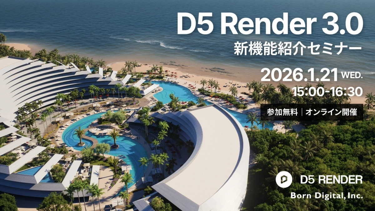 株式会社ボーンデジタルは、リアルタイムレンダラー「D5 Render」の最新アップデート「D5 Render 3.0」の新機能を紹介するオンラインセミナーを、2026年1月21日(水)に開催します。参加費は無料で、建築ビジュアライゼーションに携わる方々にとって、D5 Renderの最新情報を得る良い機会となるでしょう。