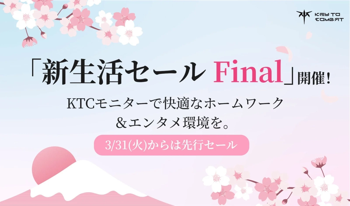 KTCは、ゲーミングモニターブランド「KTC」として、春の大型キャンペーン「新生活セール Final」を2026年3月31日(火)から4月6日(月)までの期間限定で開催しています。このセールでは、KTCストアの全商品が特別価格で提供されており、特に「高精細」「高リフレッシュレート」「大画面」という特徴を持つ3つのWQHDモニターが注目されています。