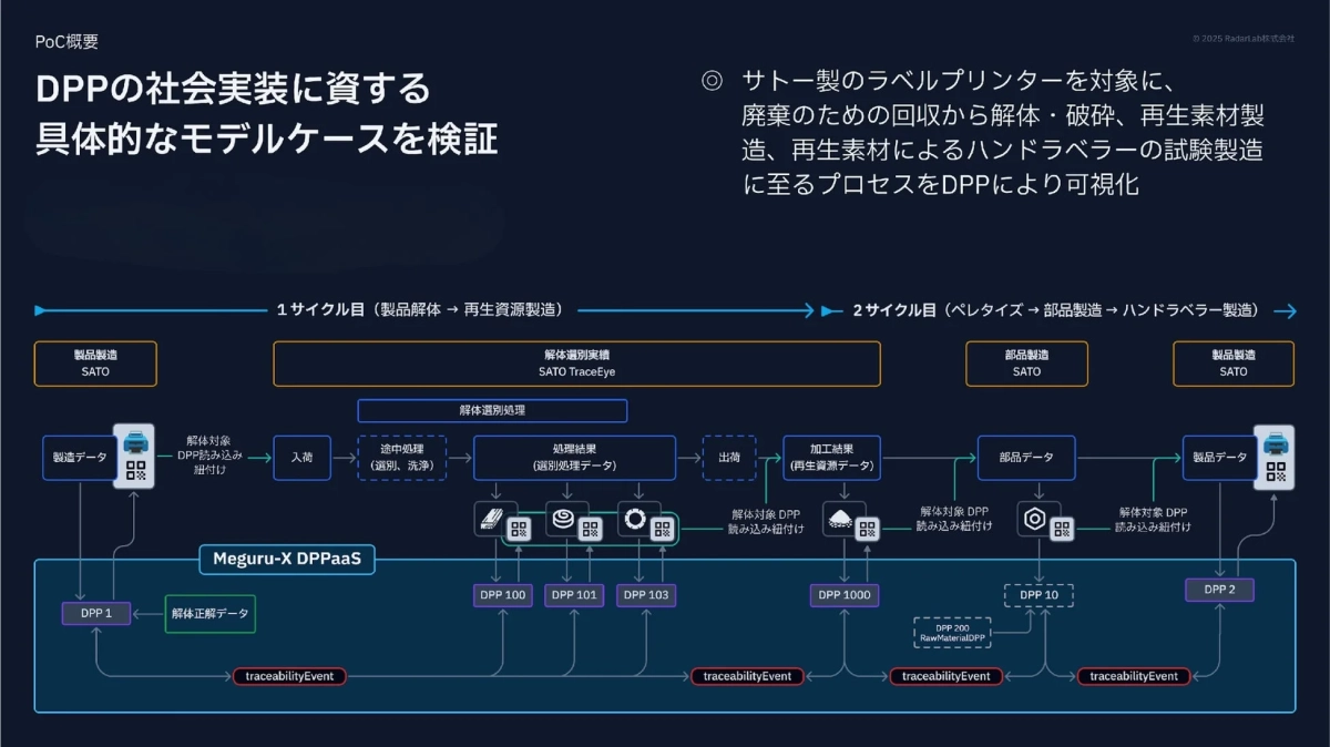 RadarLab株式会社は、株式会社サトー、株式会社ナカダイホールディングスとの共同で進めてきたデジタル製品パスポート(DPP)の実証実験で、技術検証を終えました。この実験では、製品が作られてから、使われ、分解され、再び材料として利用されるまでの全ての情報を、バラバラに管理するのではなく、製品ごとのIDを元に連携させる仕組みを試しました。その結果、企業同士が協力して資源を無駄なく使う「資源循環モデル」が、技術的に実現できることが確認されました。